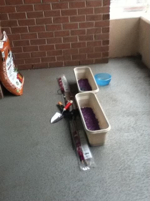 I brought my goodies from my trip to Home Depot to the balcony and surveyed the results. I have everything I need for now, at least to get some planting started.